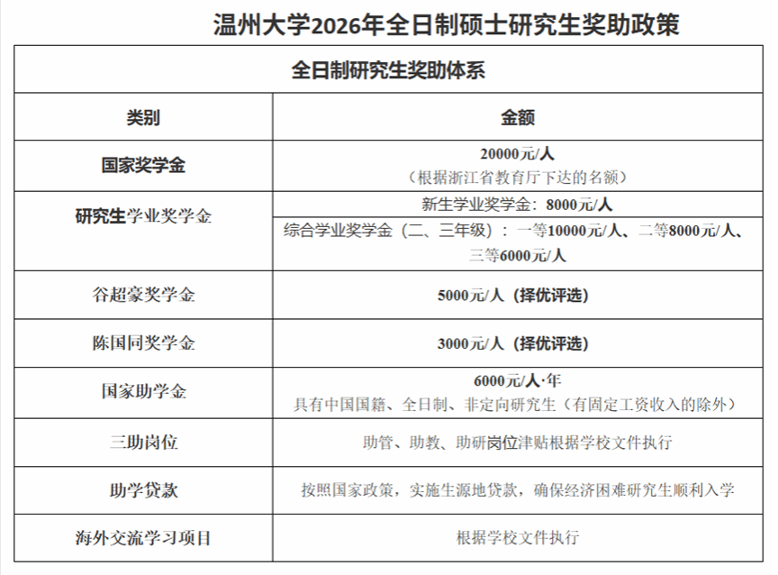 三、温州大学2026年硕士研究生学费与奖助政策